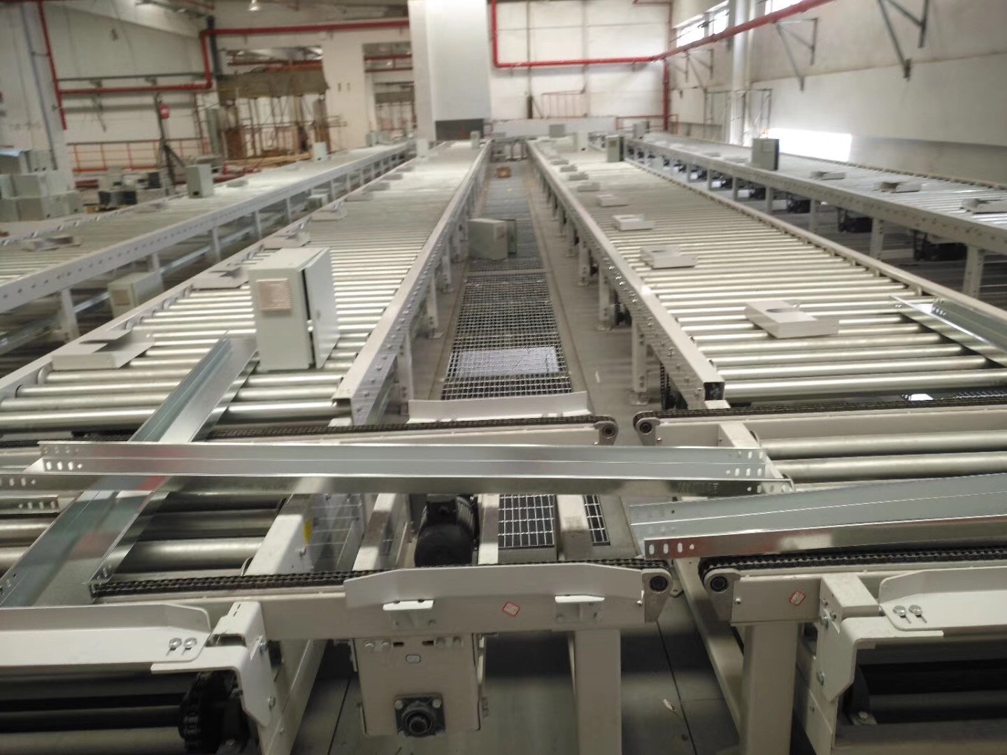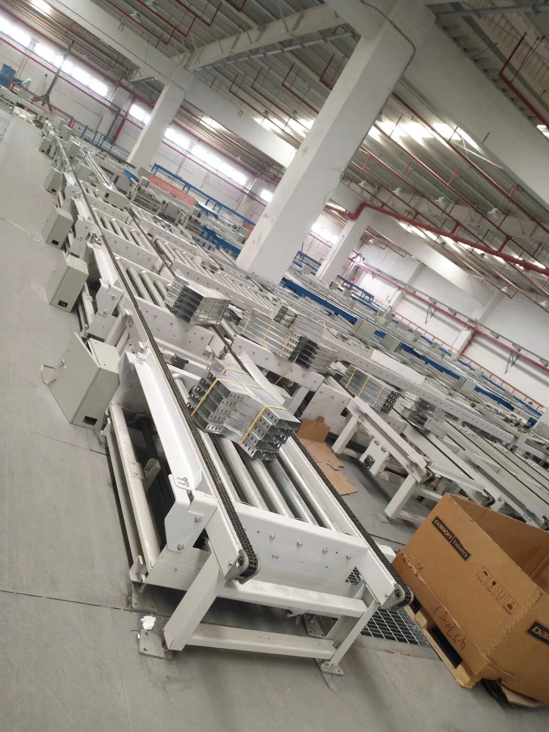 輥筒輸送機(jī)是一種非常適合重載的輸送設(shè)備。大體分動力輥筒和自由輥筒兩種。可以制作成轉(zhuǎn)彎輸送和分流合流輸送系統(tǒng)。滾筒材質(zhì)多為碳鋼鍍鋅、不銹鋼、鋁合金材質(zhì)。機(jī)體多由碳鋼/不銹鋼板材或槽鋼制作而成。能夠輸送單件重量很大的物料,或承受較大的沖擊載荷。軸承的安裝有注塑軸套式和壓套式兩種。動力輥筒驅(qū)動方式有單鏈輪、雙鏈輪、O型皮帶、高速平面?zhèn)鲃訋У刃问健?適用于各類箱、包、托盤等整體貨件的輸送。設(shè)備特點(diǎn):滾筒線之間易于銜接過濾,可用多條滾筒線及其它輸送設(shè)備或?qū)C(jī)組成復(fù)雜的物流輸送系統(tǒng),完成多方面的工藝需要??刹捎梅e放滾筒實現(xiàn)物料的堆積輸送,結(jié)構(gòu)簡單,可靠性高,使用維護(hù)方便。